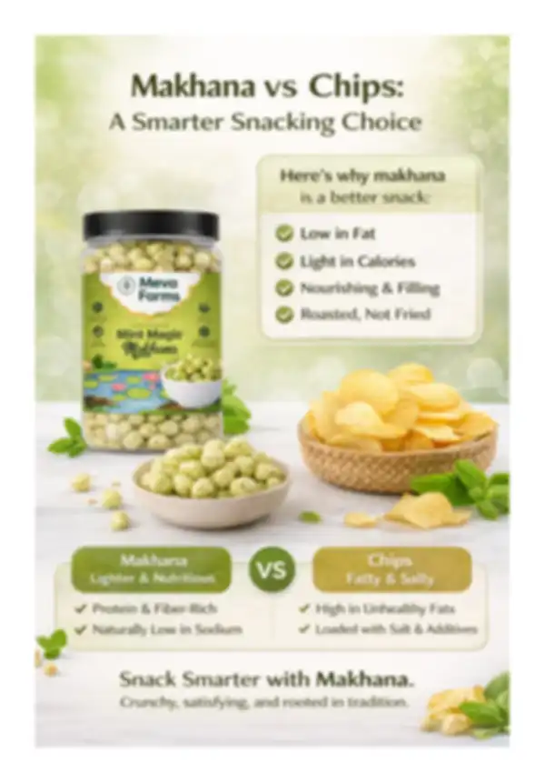Chips are typically deep-fried and heavily processed, which makes them calorie-dense and easy to overeat. Makhana, on the other hand, is naturally low in fat, rich in fibre, and gently roasted, making it easier to digest and more satisfying.
